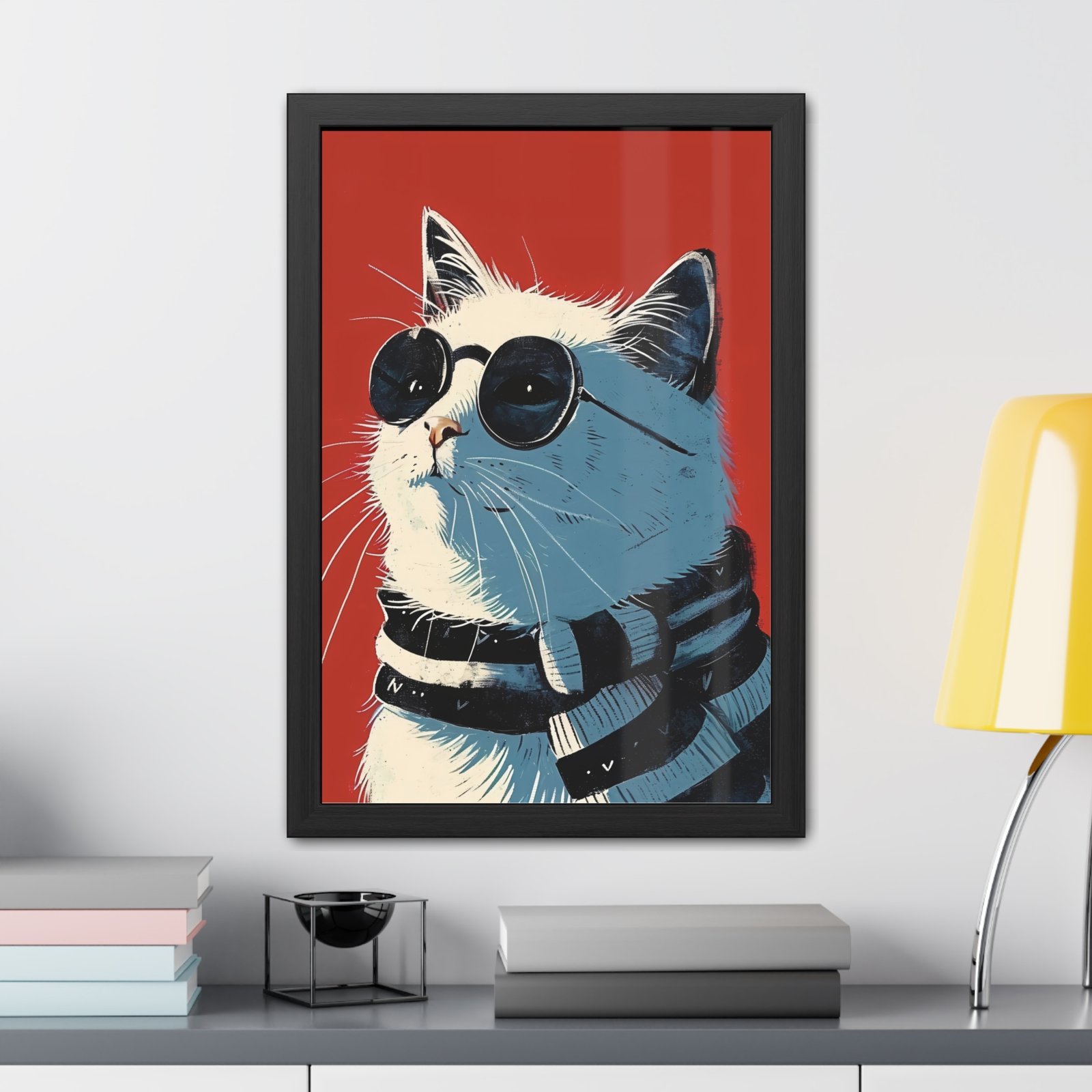 Elevate your space with this Cat with Glasses Art framed poster. The vibrant colors and high-quality materials make it a perfect addition to any room, adding a fun and whimsical touch. Ideal for cat lovers and those looking to add a pop of color to their home decor. Perfect for gifting on birthdays, holidays, or just because.