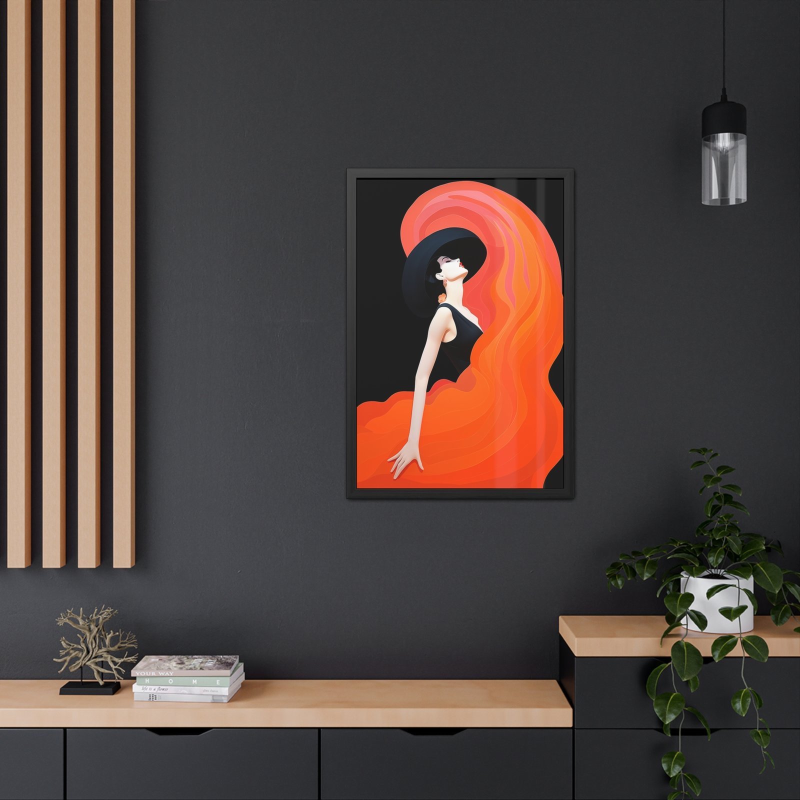 Add a touch of elegance and sophistication to your space with this stunning fashion-inspired illustration poster. Featuring a graceful woman in a black dress and hat, with a vibrant orange flow of fabric, this artwork captures movement and style in a unique, eye-catching way. Printed on premium 200 gsm semi-gloss coated paper and framed in a handcrafted wooden frame, this poster is ready to hang, making it a perfect statement piece for your living room, bedroom, or office. Ideal for fashion enthusiasts and art lovers alike, this framed print brings an artistic flair to any decor.