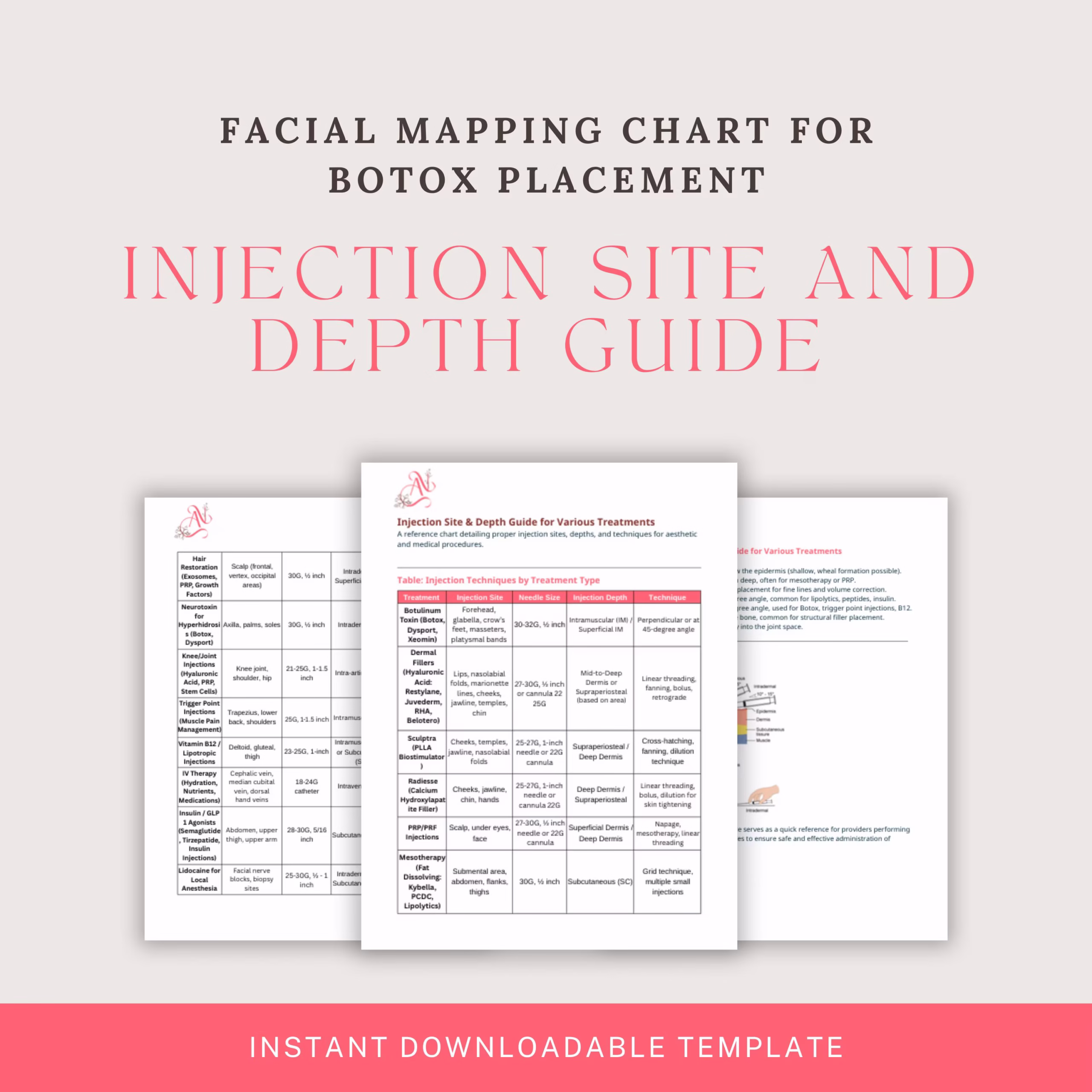Designed with a clean, easy-to-read format, it serves as a convenient reference for injectors working with neurotoxin, dermal fillers, PRP/PRF, biostimulators, fat-dissolving injectables, joint injections, IV therapy, vitamin injections, and more.